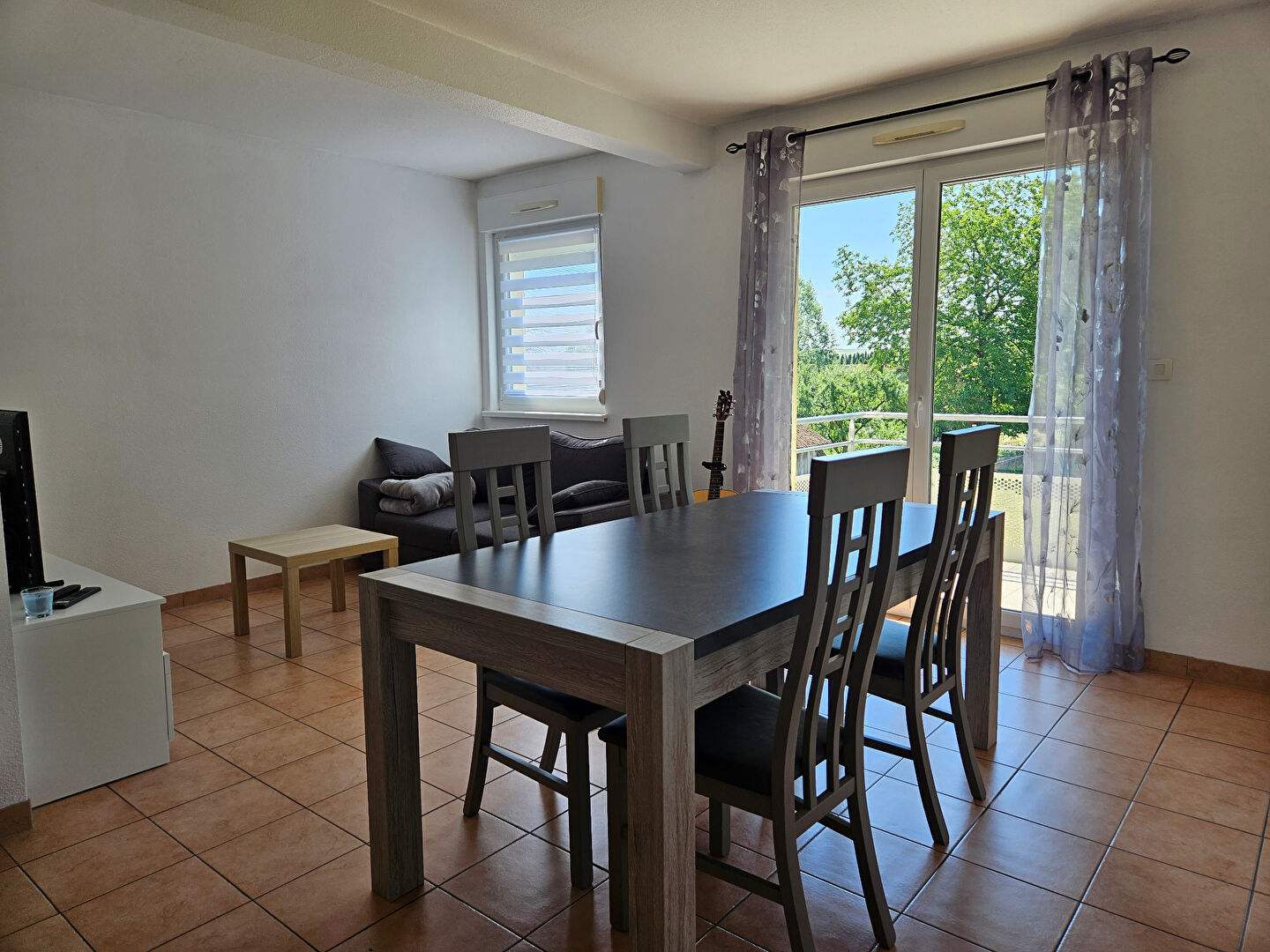Appartement 3 pièces à Erstein dans la Rue des Bobineurs, au 1er étage avec ascenseur, d'une surface habitable de 68m2, comprenant une entrée avec placard, un séjour avec accès à une terrasse de 12m2, une cuisine équipée, un dégagement avec placard, 2 cha...