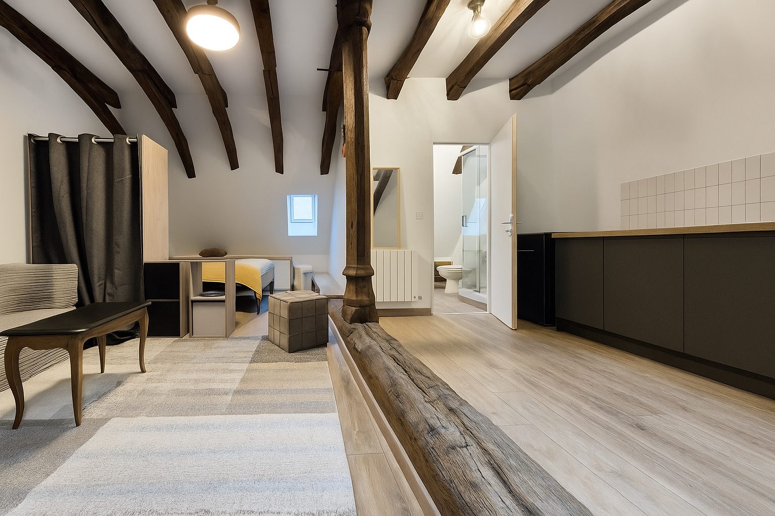 Maloé Immobilier vous propose, à BEAUNE, au centre ville, au deuxième et dernier étage d'un immeuble historique, un spacieux studio, d'environ 40m² au sol, entièrement rénové et aménagé avec goût.