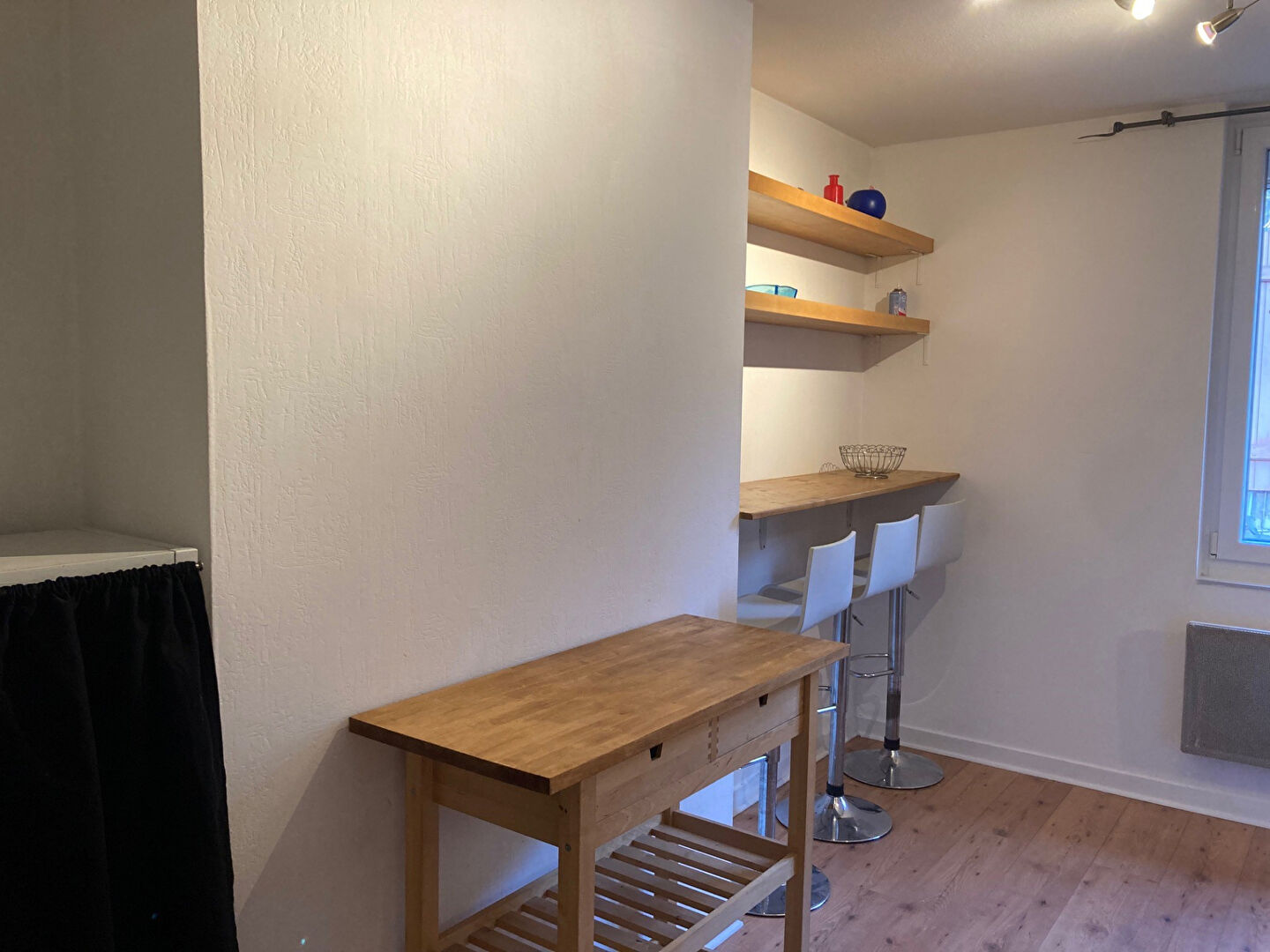 REF : 8009 T2 meublé situé 6 Grande Rue, 40 m², entrée sur pièce principale avec cuisine ouverte équipée (frigo, plaque de cuisson, hotte, petit lave-vaisselle et lave-linge séchant à titre gracieux), chambre avec placard équipé, salle d'eau ouverte (douc...