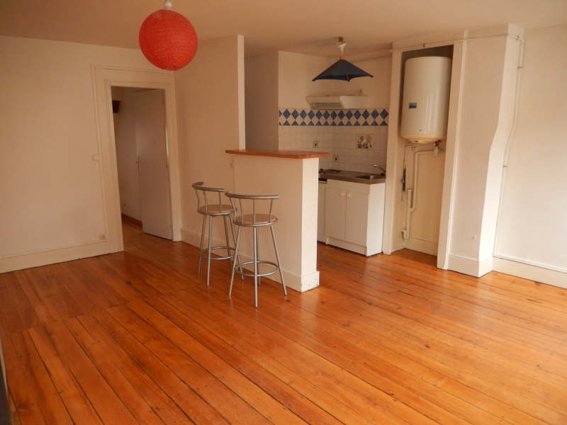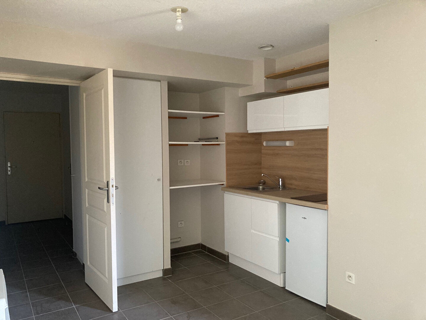 T2, Centre ville, 2 rue Bersot, 34 m², 3° étage, entrée avec placard, kitchenette équipée (frigo TOP + plaques électriques) ouverte sur grande pièce à vivre avec séparation bar, 1 chambre, chauffage individuel électrique, double vitrage, LIBRE