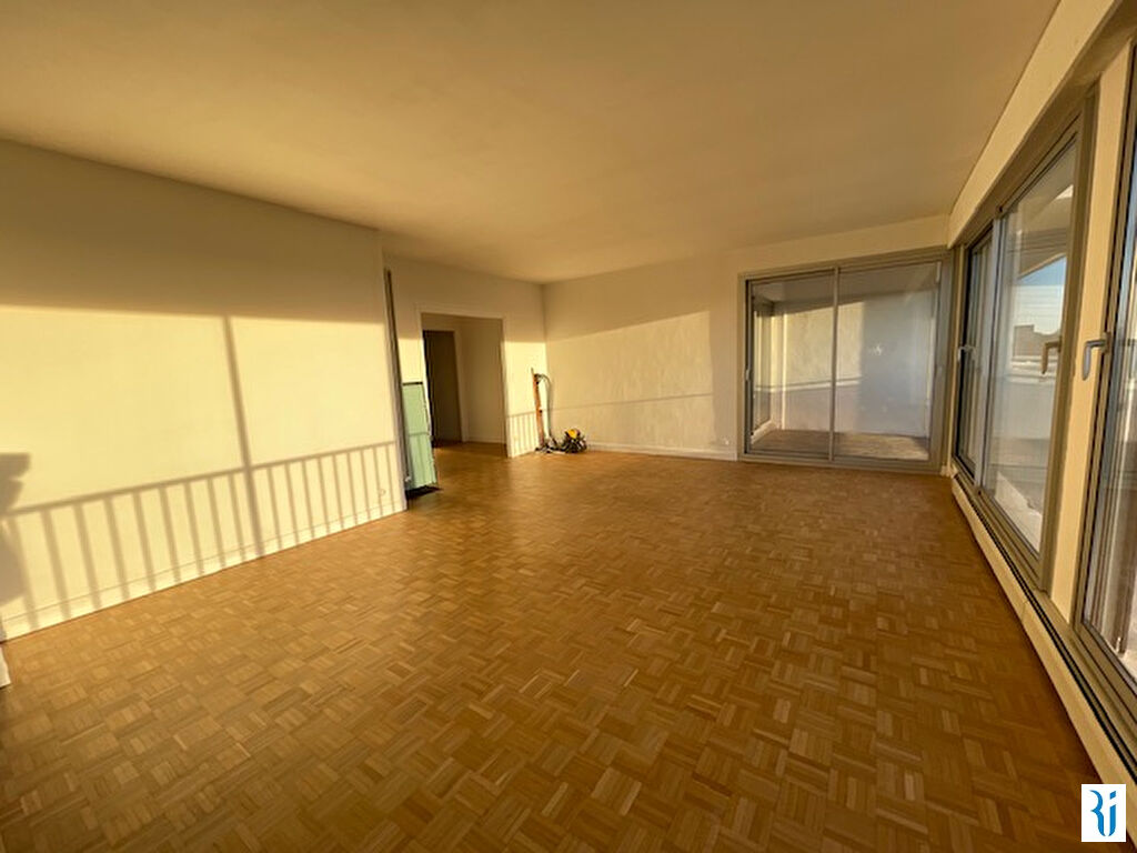 Dans une résidence calme et sécurisée, appartement F3 de 85,57 m², au 1er étage, comprenant : entrée, séjour exposé SUD avec grande loggia et vue très dégagée sur Rouen, cuisine aména...