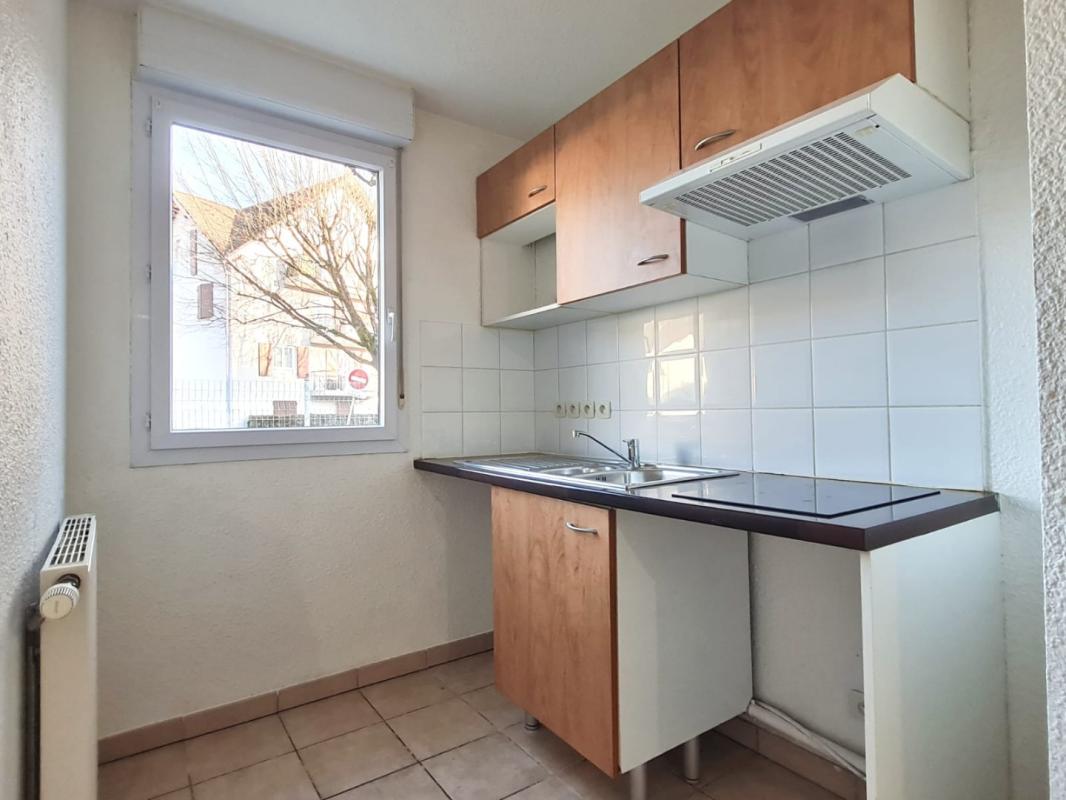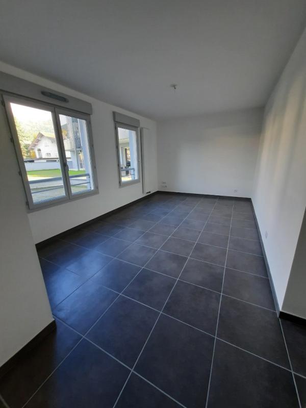 Bonneville, dans résidence récente appartement T2 au RDC comprenant un hall avec placard, une chambre, une salle de bain, une cuisine aménagée semi équipée ouverte sur le salon avec une terrase puis un garage.