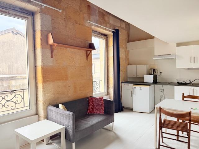 Bordeaux loue T1 meublé proche Victoire - BX Victoire - Bordeaux, cours de la Somme, loue T1 meublé de 34m² au 2e étage et dernier étage d'un petit immeuble pierre. Appartement traversant avec entrée, séjour/chambre, cuisine séparée aménagée et équipée (p...