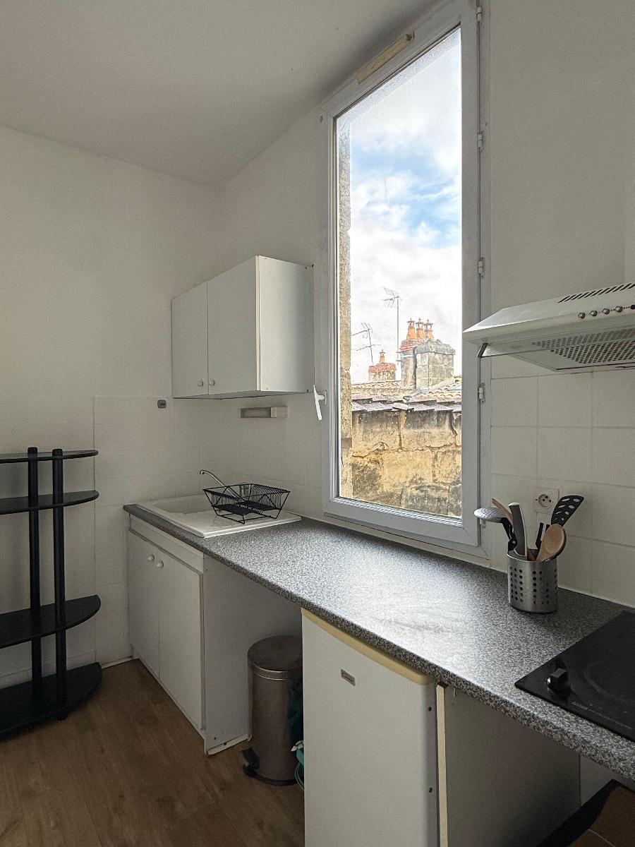 BX Victoire - Bordeaux, cours de la Somme, loue T1 meublé de 34m² au 2e étage et dernier étage d'un petit immeuble pierre. Appartement traversant avec entrée, séjour/chambre, cuisine séparée aménagée et équipée (plaques, frigo top, hotte, micro-ondes, vai...