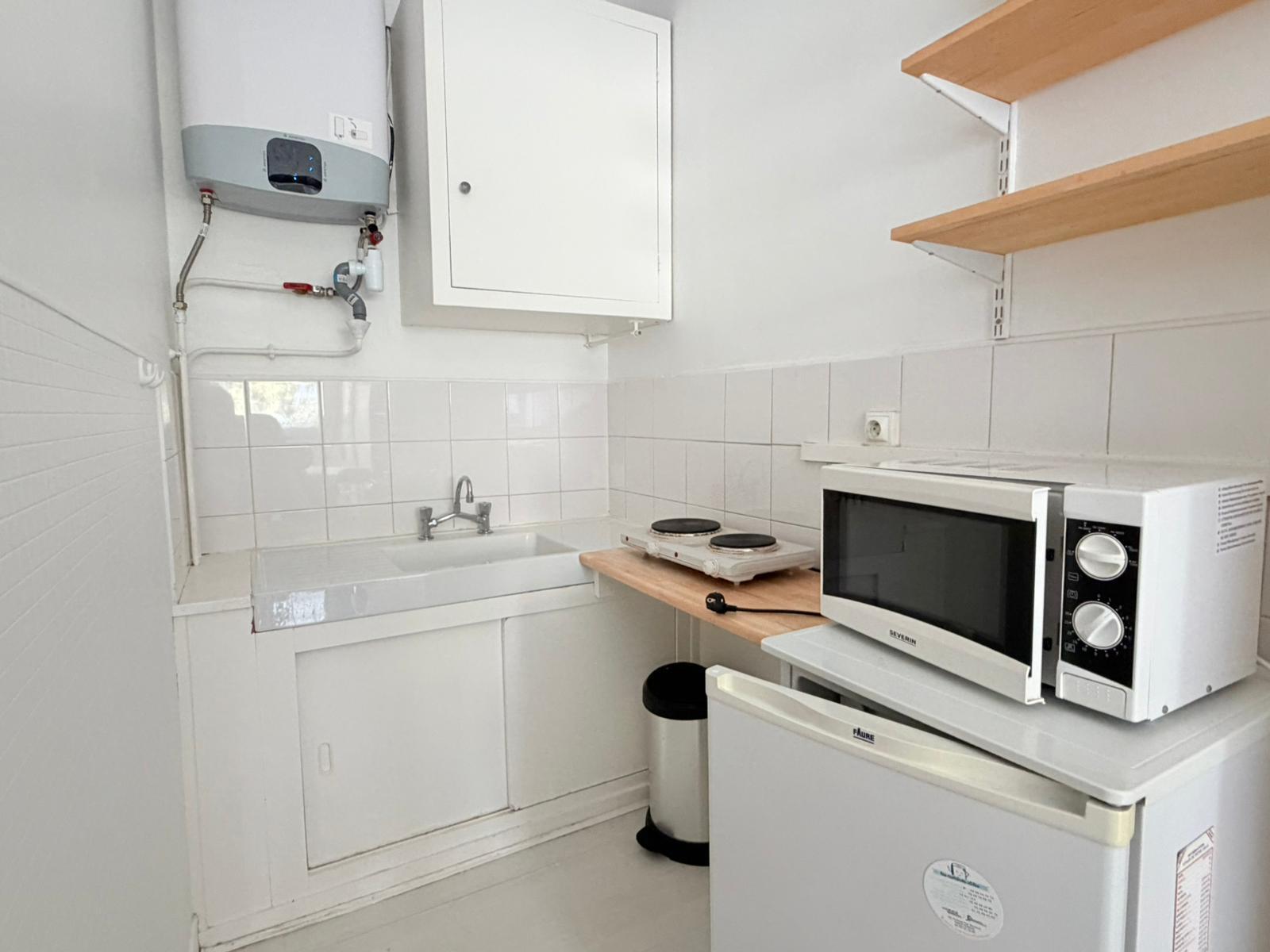Studio de 23 m2 situé en RDC arrière donnant sur une cour intérieure privative au calme : une entrée, une pièce pricipale avec un grand placard, un coin cuisine avec frigidaire, plaques de cuisson , une salle d'eau avec WC. DISPONIBLE LE 15 AVRIL