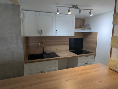 Cuisine aménagée et semi équipée, séjour- salon, une chambre, salle de bains avec WC,