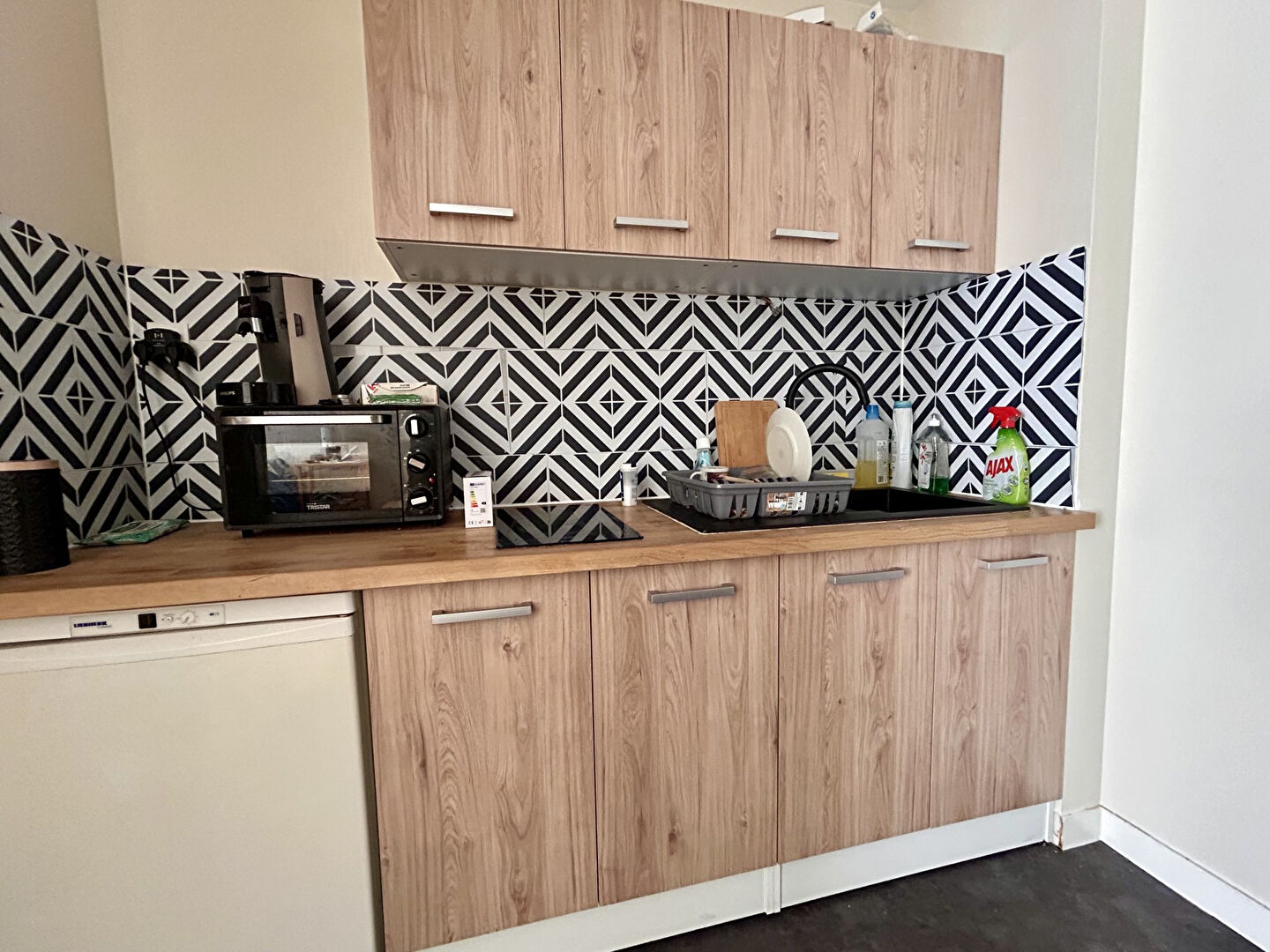 À louer , studio au rez-de-chaussée de 23.11 m2 comprenant une pièce de vie avec kitchenette aménagée et équipée (meubles hauts et bas, plaque de cuisson, réfrigérateur, évier, hotte), ainsi qu'une salle d'eau avec wc et sèche serviette.
