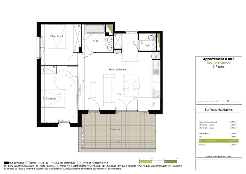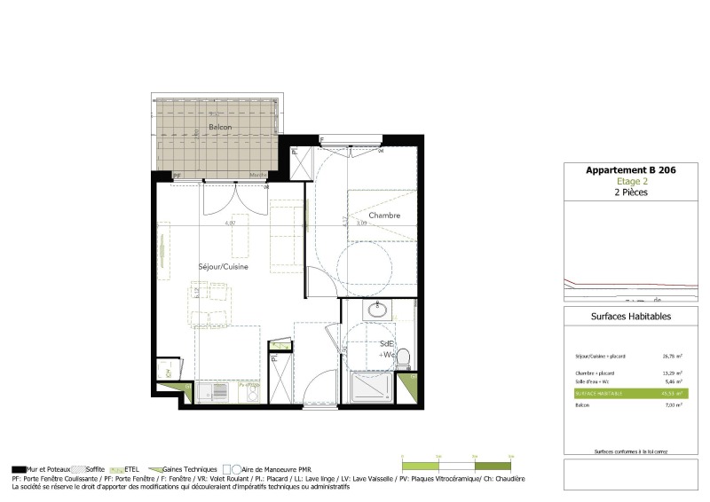 Appartement de type T2 situé au 1er étage comprenant salle de séjour avec cuisine équipée, une chambre avec salle d'eau, WC et une terrasse.