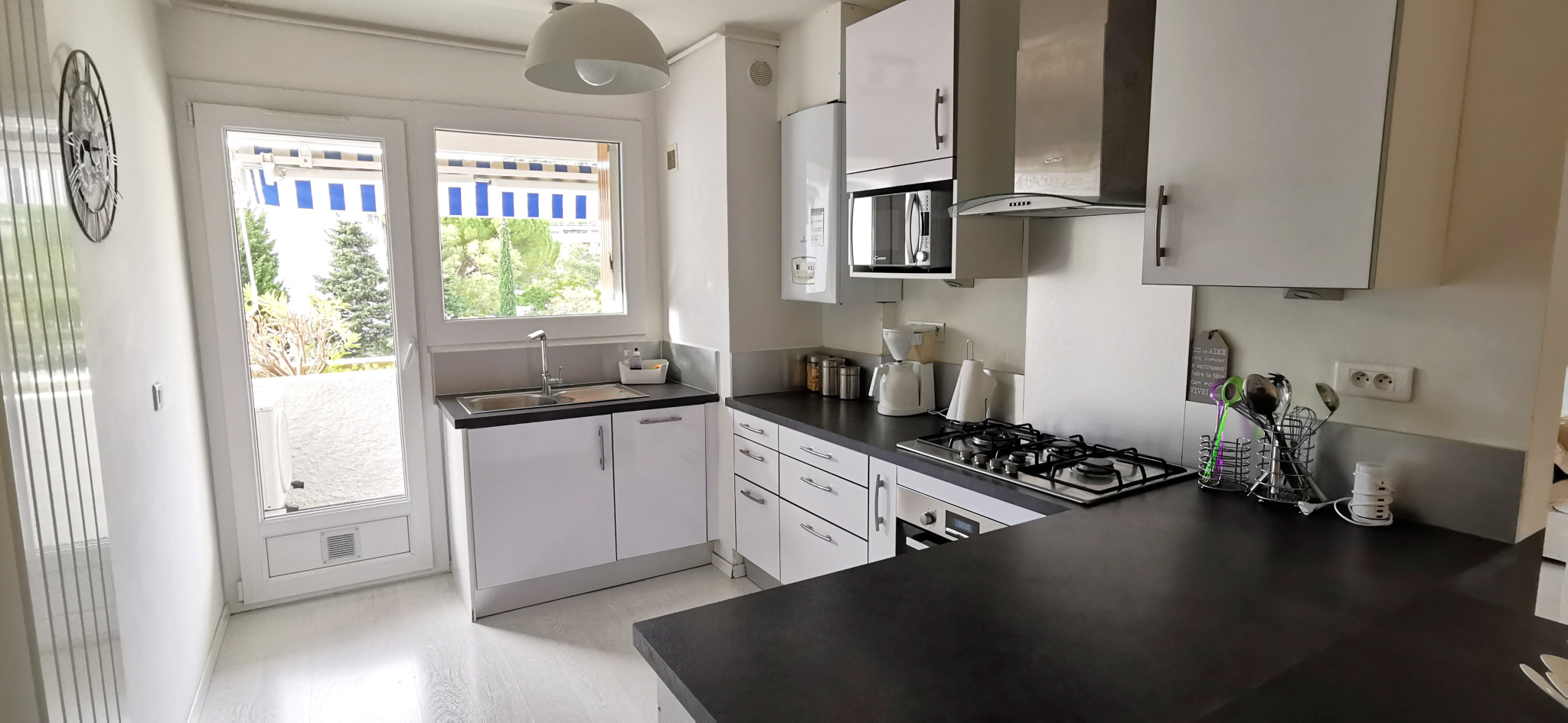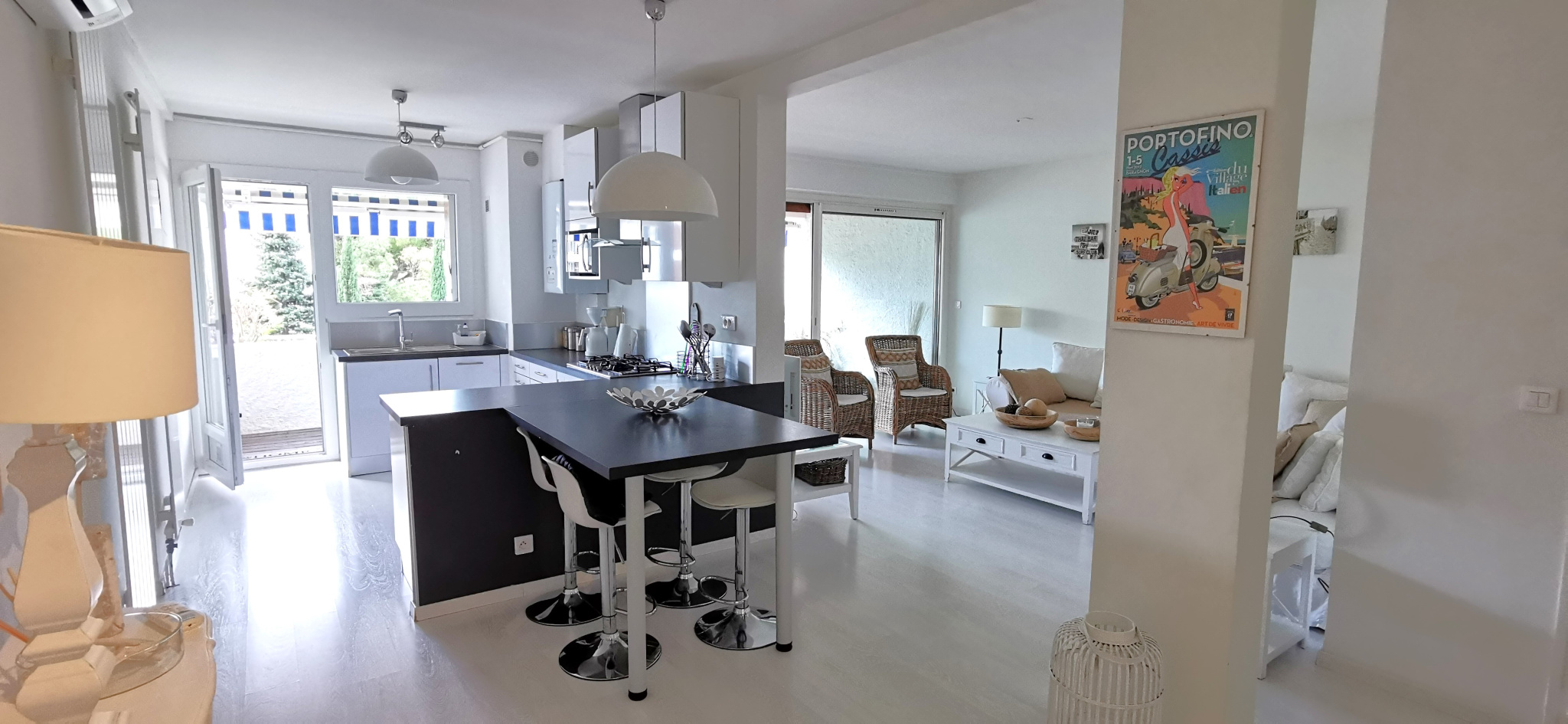 Cassis - Location meublée à l'année - Dans résidence appréciée au centre de Cassis, très bel appartement de type 3 climatisé totalisant près de 72 m2 habitables. Il se compose d'une entrée, un séjour et une cuisine ouverte donnant sur vaste terrasse ...