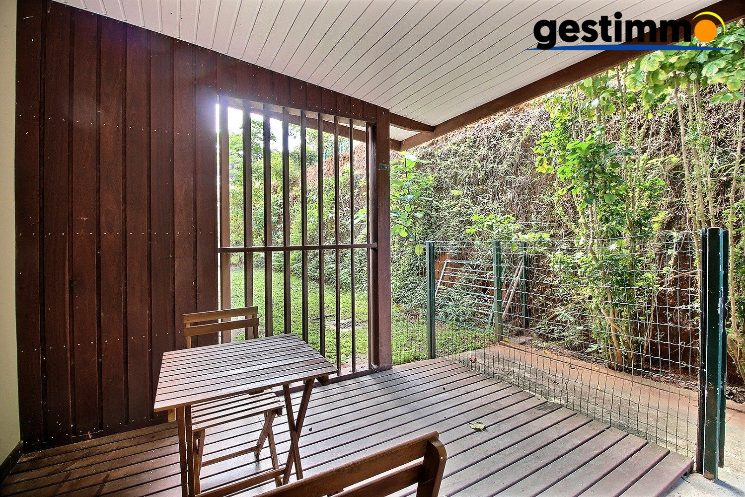 Un studio situé au rez-de-chaussée avec jardinet privatif et comprenant une pièce principale climatisée avec un coin cuisine aménagé et équipé avec une plaque électrique et une hotte, une salle d'eau avec WC et une varangue
