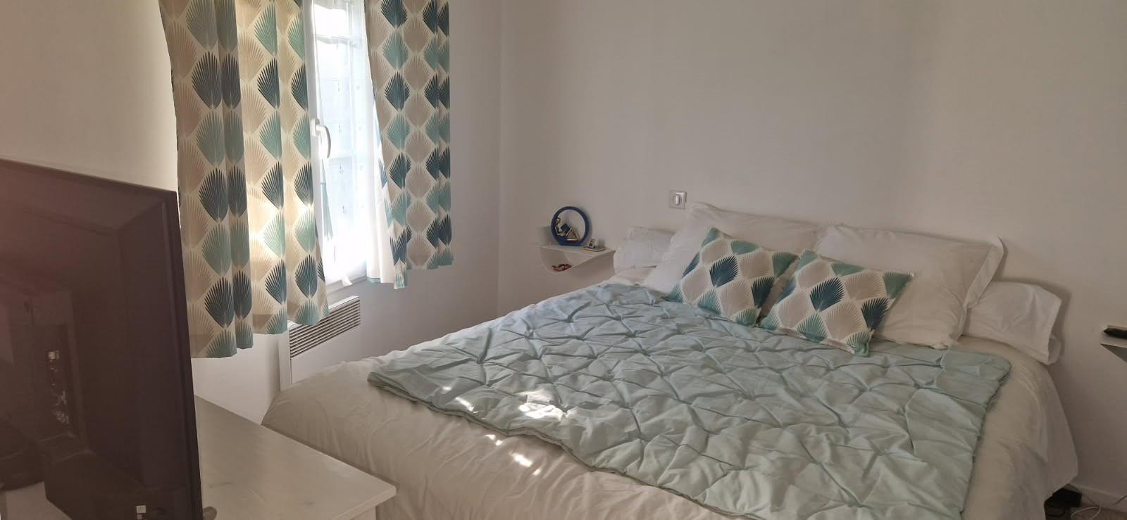 Appartement rénové comprenant : Entrée, séjour ouvert sur cuisine aménagée et équipée, dégagement avec placards, deux chambres dont une avec placard, salle d'eau (lavabo, douche à l'italienne), WC.