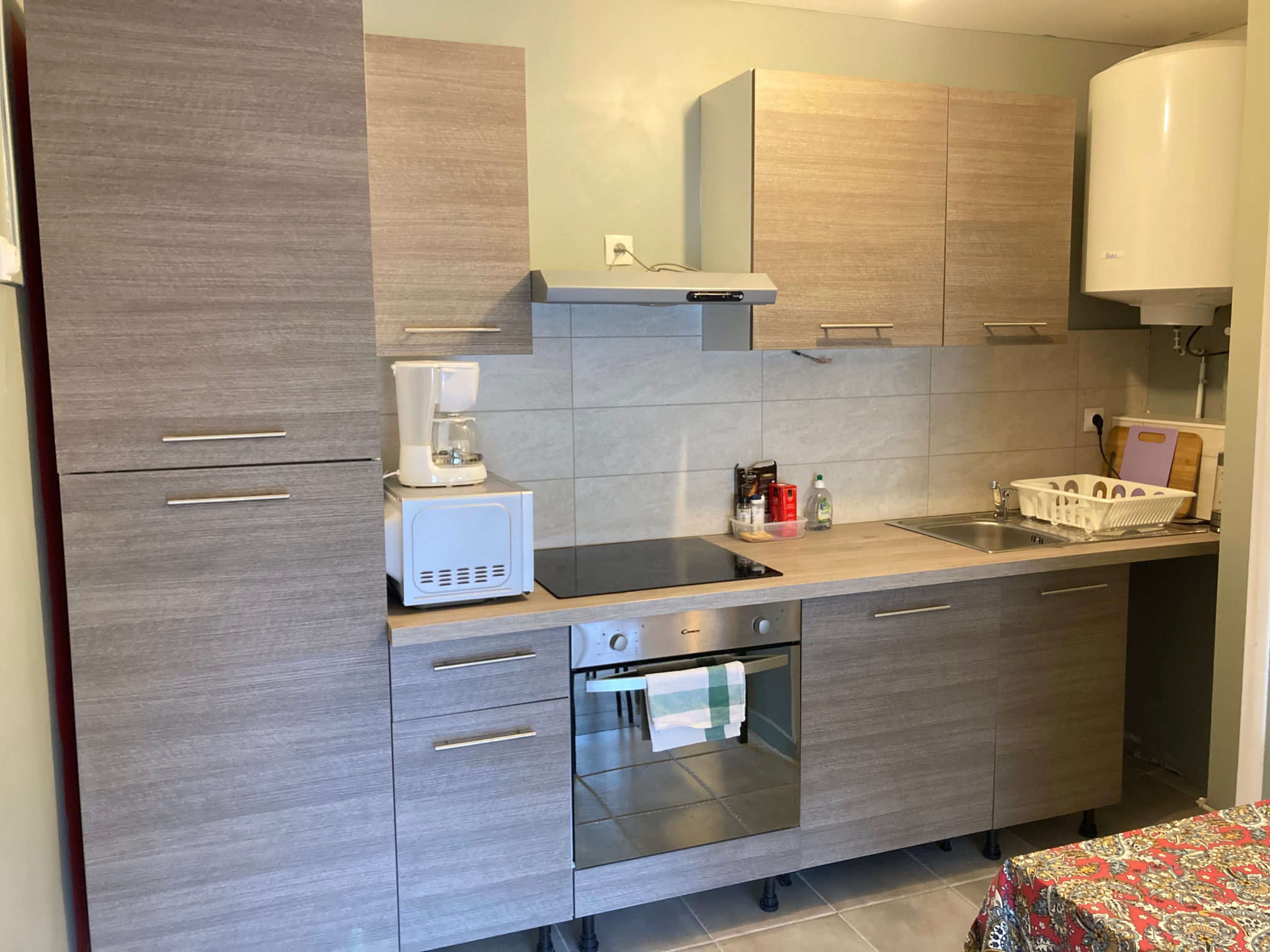 Pièce de vie avec coin cuisine équipé (plaque électrique, réfrigérateur, four), chambre séparée et salle d'ea...