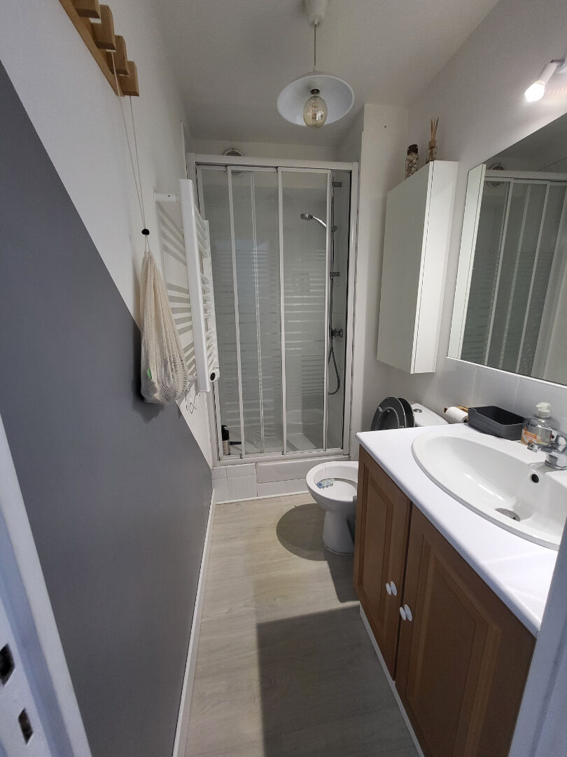 Cet appartement dispose d'une entrée, une pièce de vie lumineuse avec coin cuisine entièrement équipé, une salle d'eau avec douche, un WC séparé