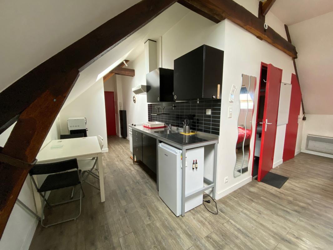 STUDIO plein centre comprenant un séjour avec coin cuisine équipé (plaques vitro-céramiques, frigo top) et aménagé, coin nuit en mezzanine, une salle d'eau avec wc, une lingerie.