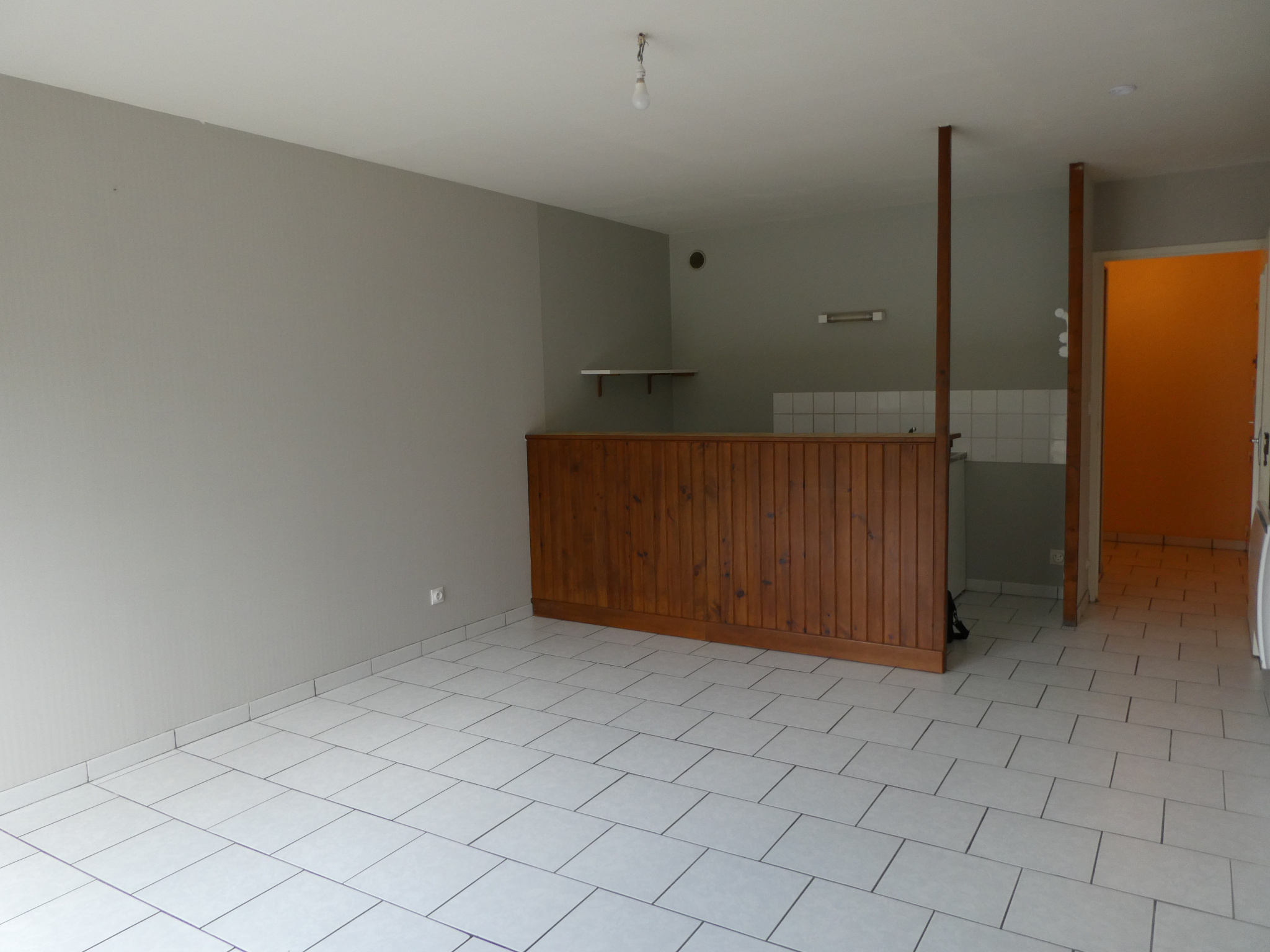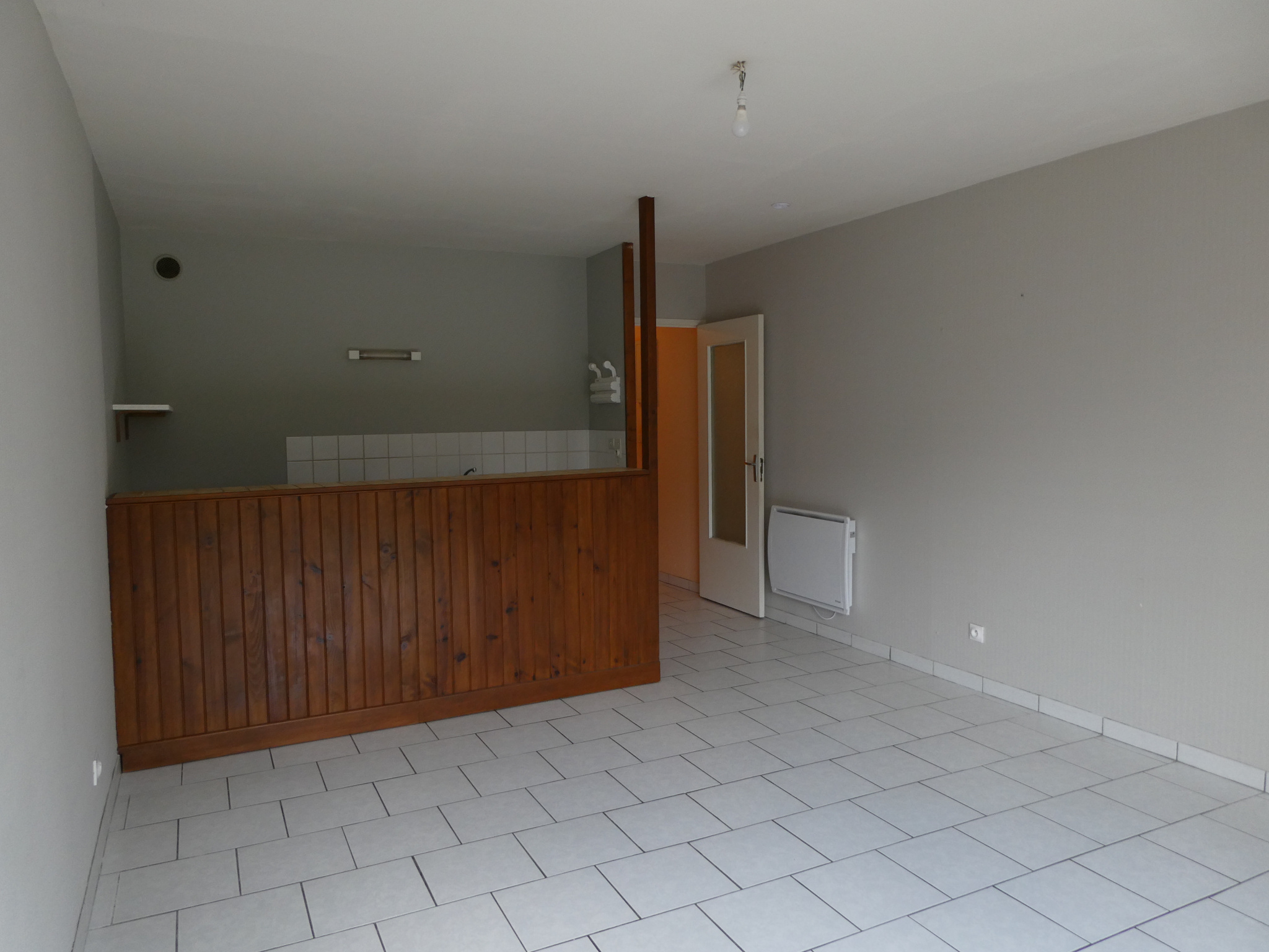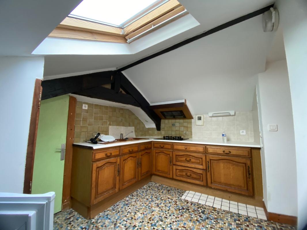 CENTRE VILLE, 1er étage, appartement comprenant une pièce principale avec coin cuisine aménagé et équipé de plaque, hotte, four,1 chambre, une salle d'eau, wc séparés.