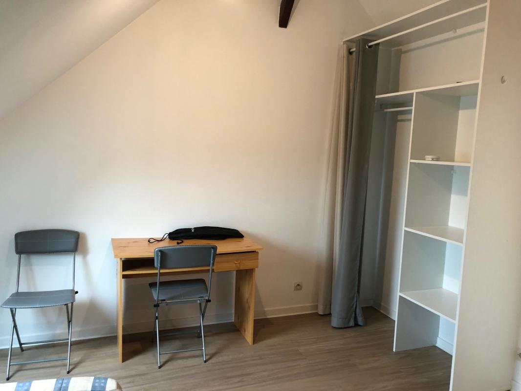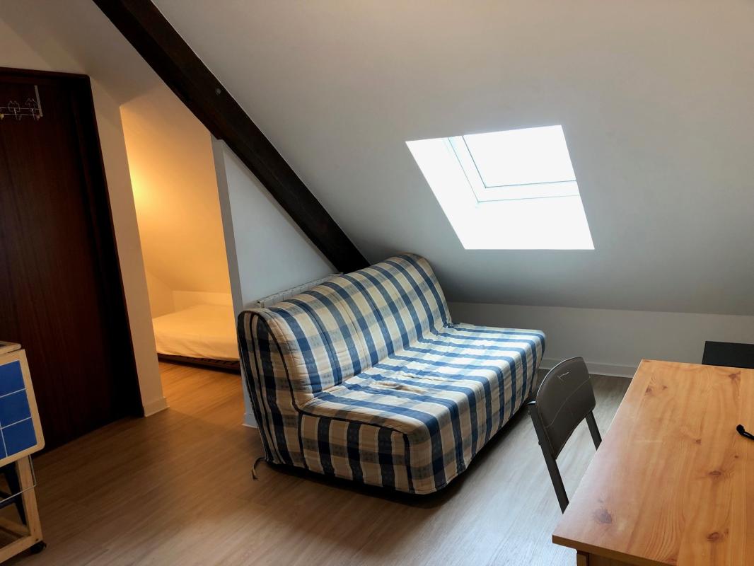 Au 4ème étage, un studio entièrement rénové et meublé comprenant une pièce principale (bureau, table pliante, canapé BZ, coin nuit avec matelas 1 place) et coin cuisine équipée (frigo top, plaques électriques), salle de bains et wc.