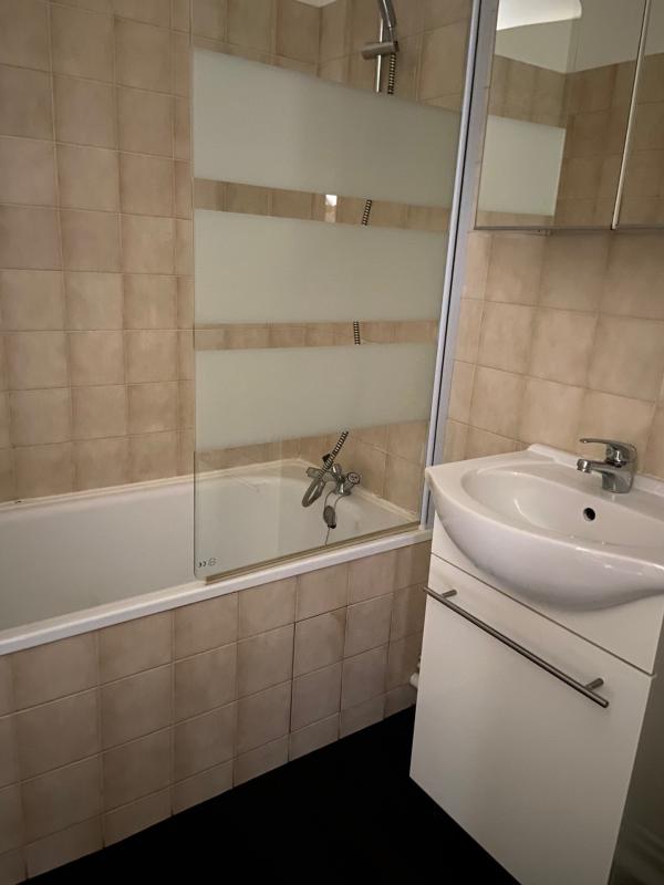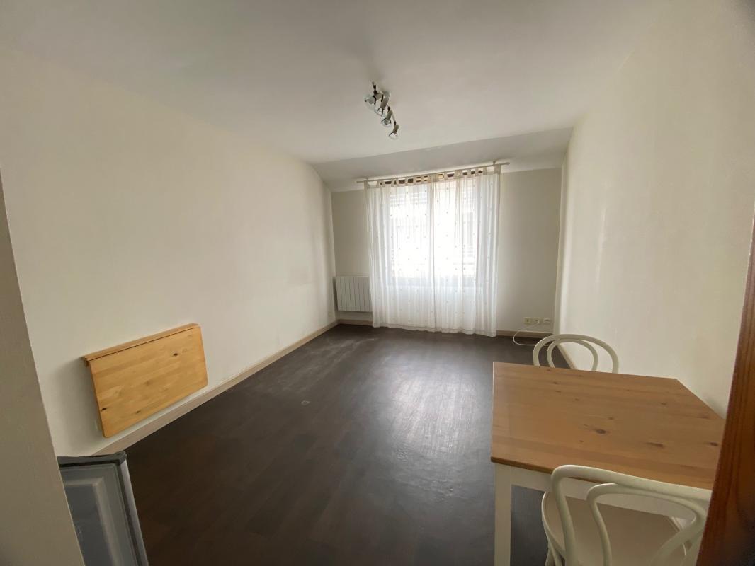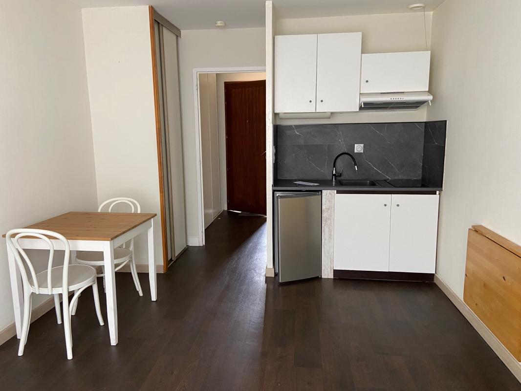 Studio très lumineux refait à neuf en centre ville entierment, dans petite résidence comprenant: une pièce de vie avec coin cuisine aménagée et éuipée (plaque, four, hotte, frigo top) et placard, une salle de bains avec wc.