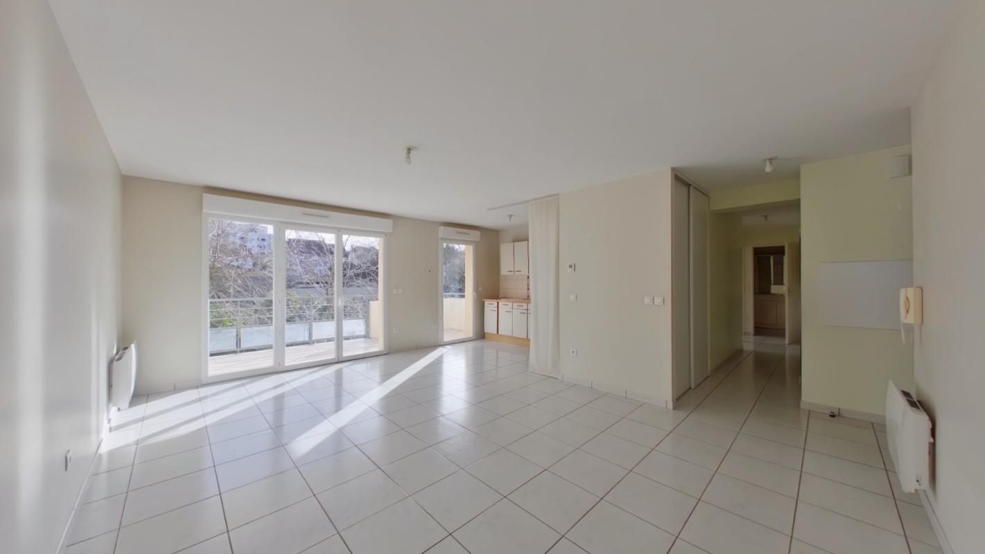 Appartement T3 avec vue sur Vienne comprenant : entrée, salon/séjour, cuisine américaine équipée, deux chambres, une salle de bains avec WC. Chauffage individuel électrique. Meubles.