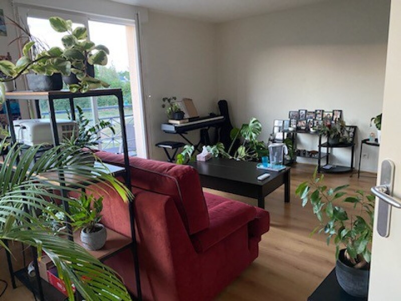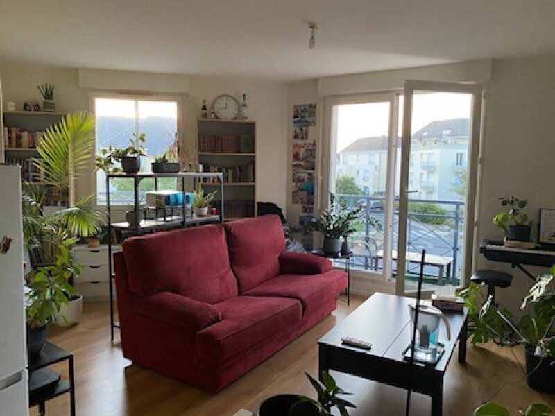 CHECY - Appartement F2 de 47m² composé d'une entrée, cuisine ouverte sur séjour avec balcon, chambre avec placard donnant sur le balcon, salle de bains avec toilettes. Cellier et place de parking extérieure.