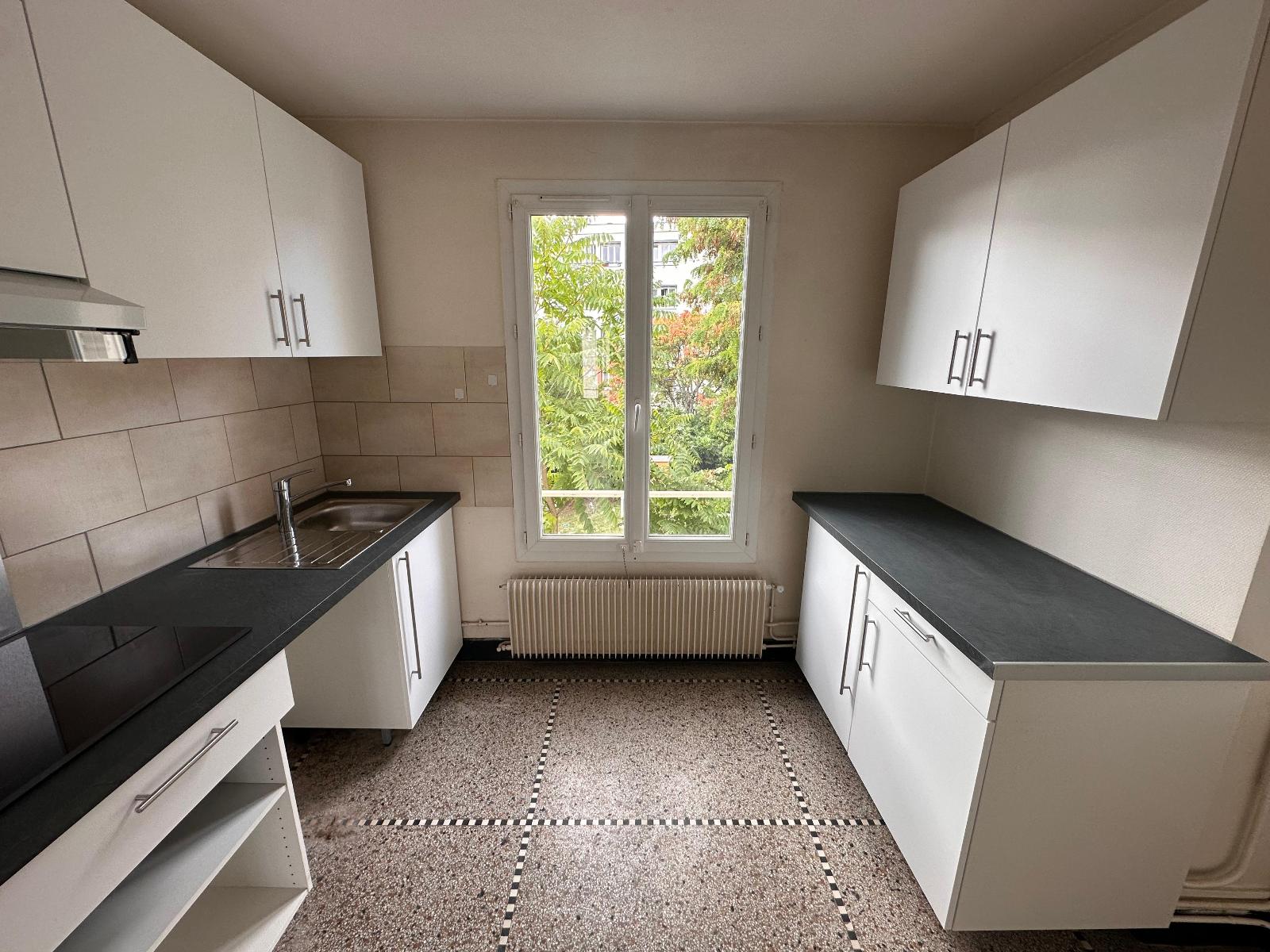 Cet appartement est composé d'une cuisine équipée et aménagée (meubles hauts et bas, hotte aspirante, plaques vitro, fri...
