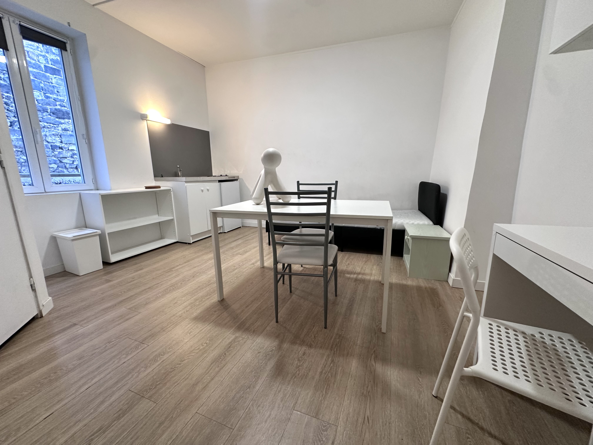 Studio entièrement meublé situé au rez-de-chaussée comprenant une entrée, une pièce de vie avec un coin kitchenette et une salle d'eau avec wc.