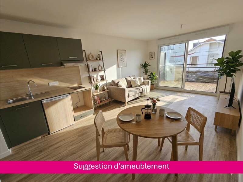 Bel Appartement T1 de 39,26 m² situé dans un immeuble récent avec ascenseur qui se compose d'une pièce de vie, d'une cuisine aménagée équipée (plaques de cuisson, hotte et frigo top), d'une salle d'eau et WC séparé....