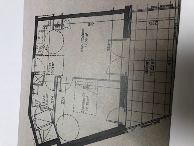 Appartement de 2Pièces de 39.25m² dans résidence BBC, comprenant une entrée donnant sur un lumineux séjour avec cuisine équipée et accès balcon, une chambre et une salle de douche avec WC.
