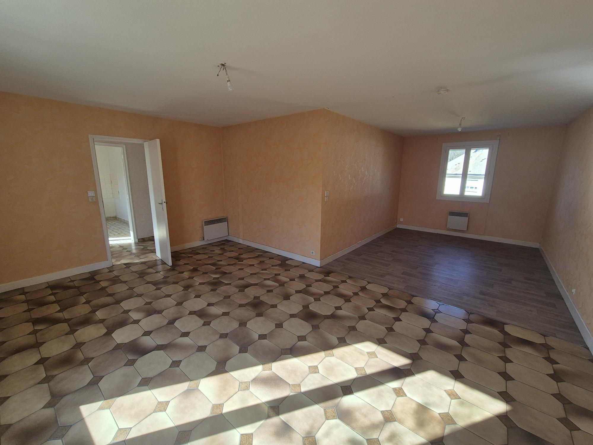 A LOUER, OBJAT, Proche centre, Appartement F3 86 m² avec garage, cave, cour privative et jardin collectif, comprenant une grande entrée, une cuisine aménagée avec placards, un séjour, 2 chambres, une salle de bain avec baignoire et douche et un WC.