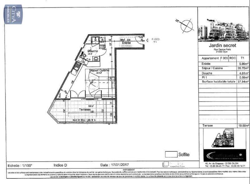 Cabinet LAURIN, son service location (03.80.50.87.62) vous propose un appartement type 3 situé 17 rue du 23 Janvier à Dijon de 45.60 m2 au 1er étage (sans ascenseur) d'une petite résidence, comprenant un espace cuisine aménagé et équipé (réfrigérateur, f...