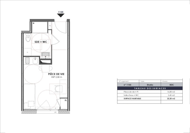 Il propose une pièce principale, une kitchenette et une salle d'eau.