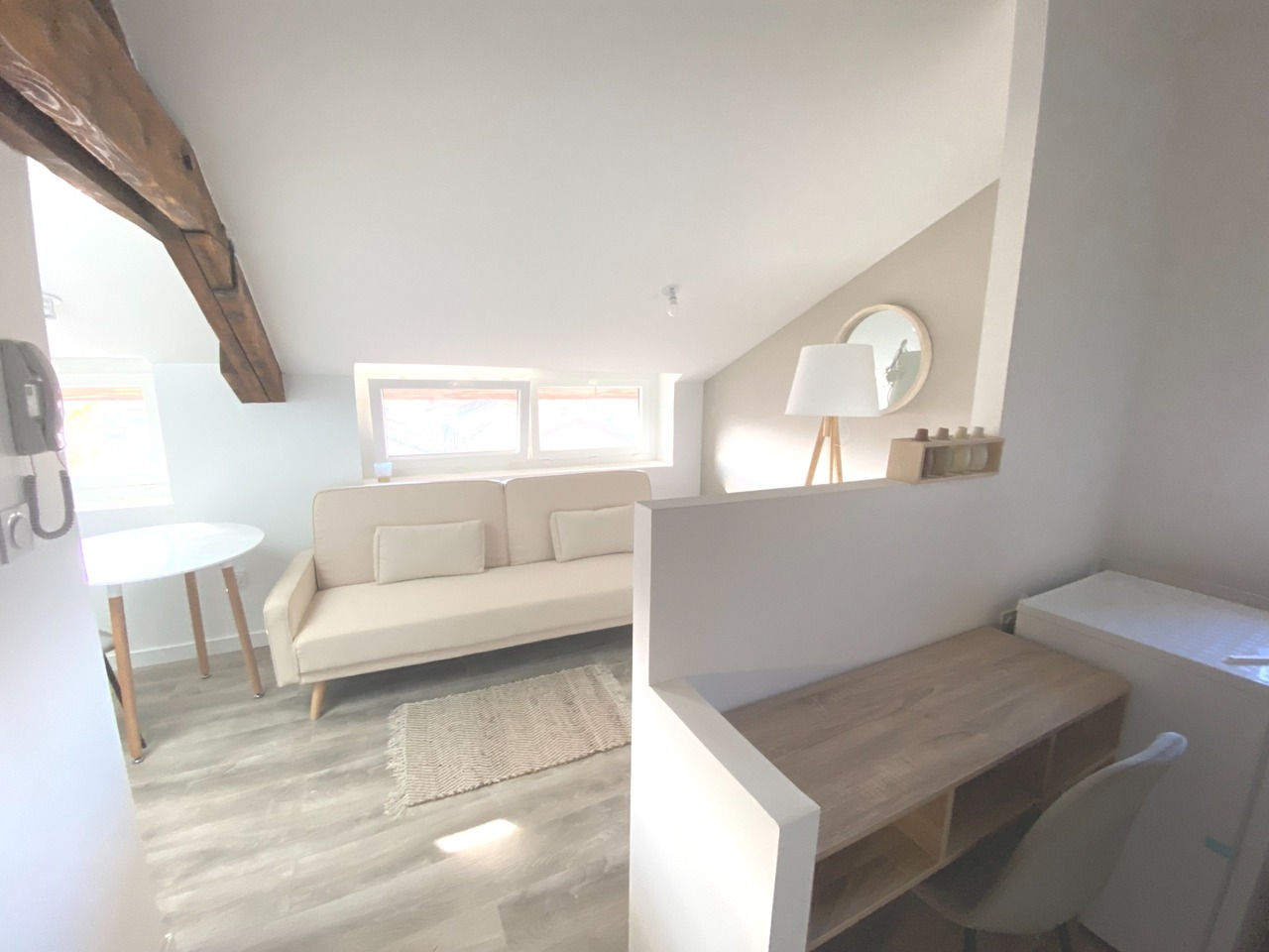 A LOUER - Au centre-ville de Tain, à deux pas des quais du Rhône, studio de 21,49m2 composé d'une pièce de vie avec cuisine équipée et un espace salon, une salle d'eau avec sanitaire, et couchage en mezzan...