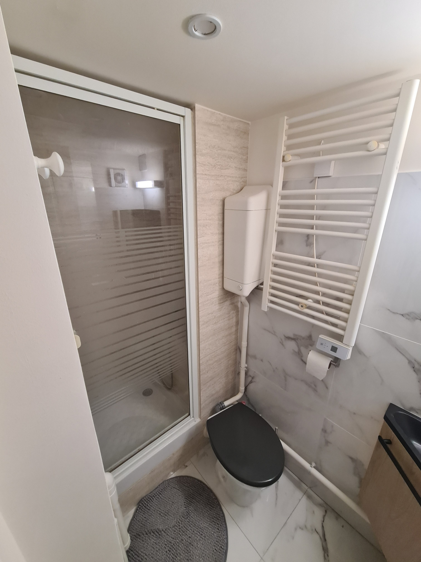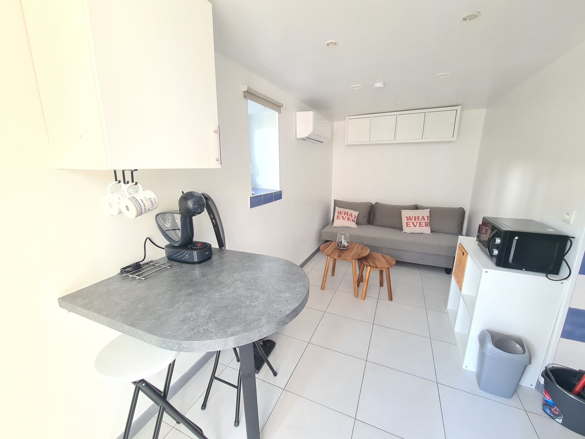 Composé d'une entrée, un séjour avec coin cuisine aménagée et équipée (plaque et hotte), placards, une salle d'eau avec WC.