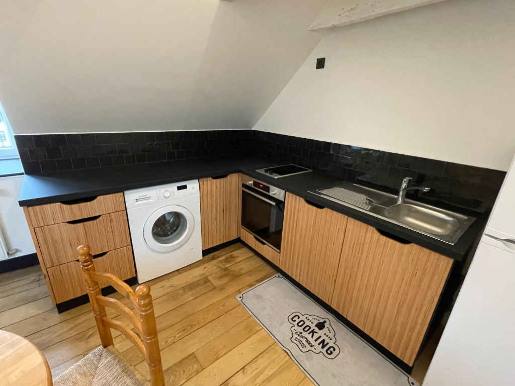 Une pièce de vie avec cuisine aménagée et équipée (four, plaque, réfrigérateur/congélateur, lave-linge), salle d'eau, WC