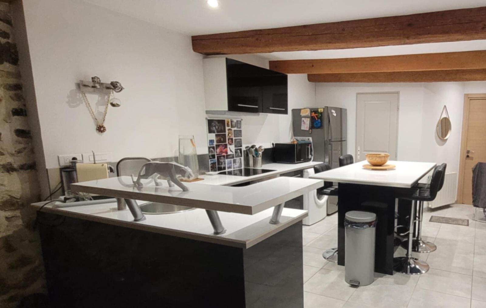 Une cuisine semi équipée (four, plaque de cuisson, hotte), avec un cellier ...
