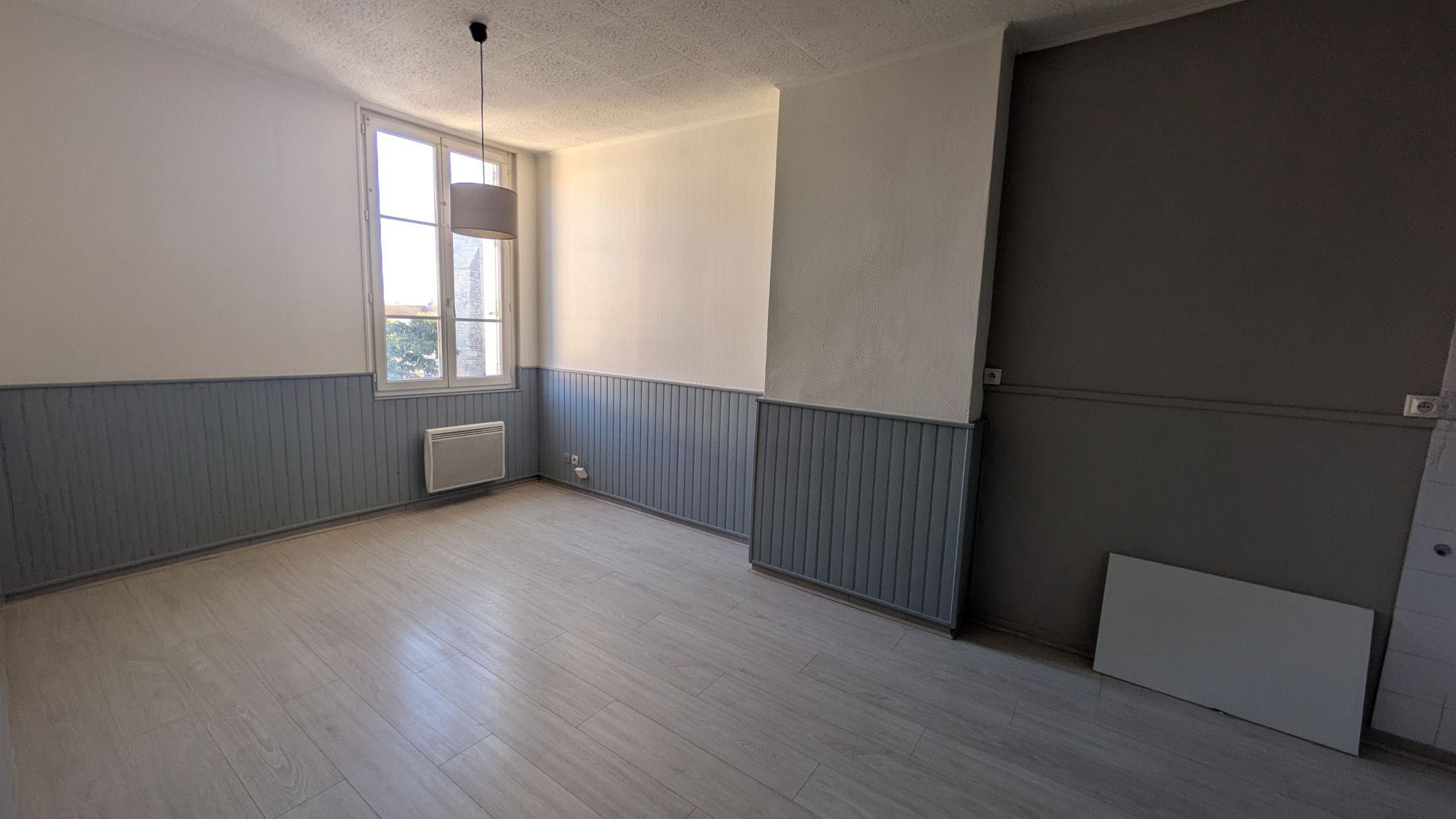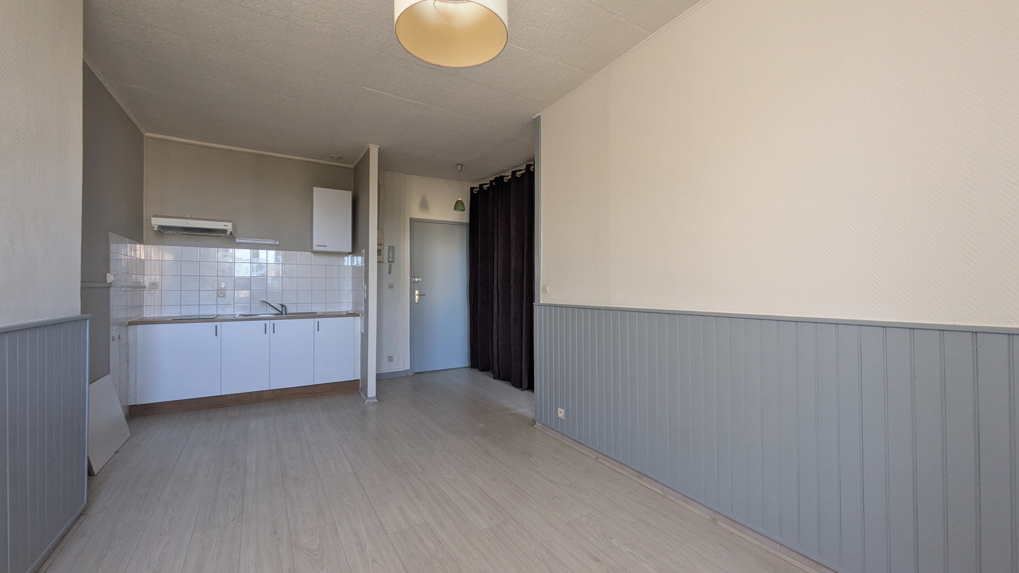 Entrée sur pièce de vie avec cuisine, 1 chambre, salle d'eau avec WC.