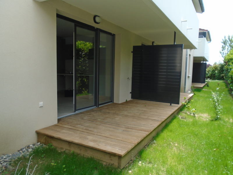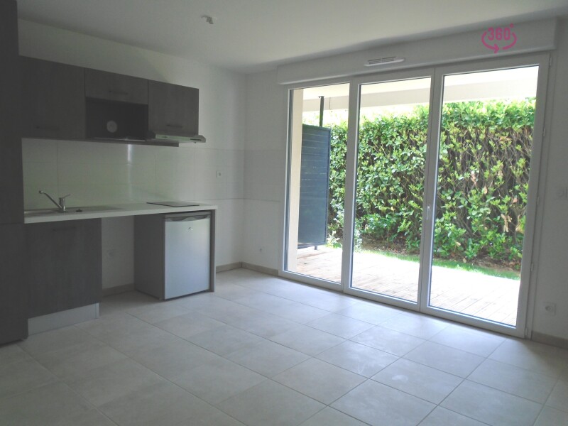 Frouzins à la location! Nous vous proposons à la lcoation ce studio, composé d'un séjour avec cuisine équipée (évier inox, plaque 2 feux, hotte, meubles hauts et bas, frigo top), une salle d'eau aménagée de WC , une terrasse de 7.10 m² , un jardi...