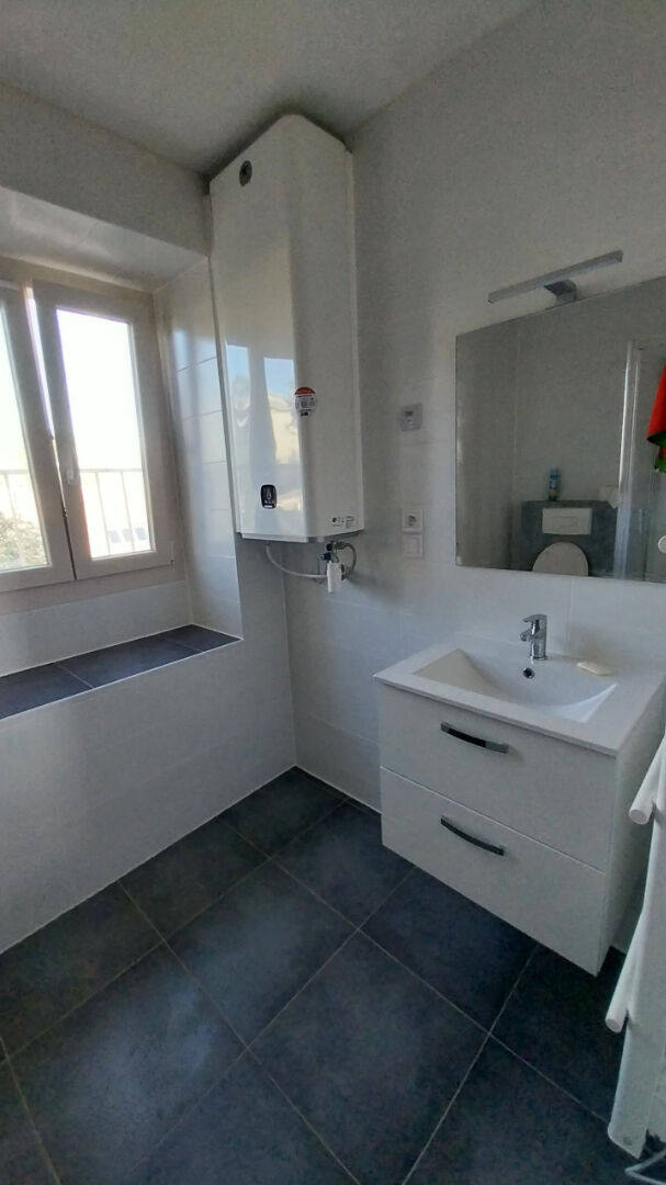 Appartement meublé comprenant une cuisine aménagée et équipée (réfrigérateur-congélateur, micro-onde, plaques de cuisson), une salle de bain avec wc et une pièce principale.