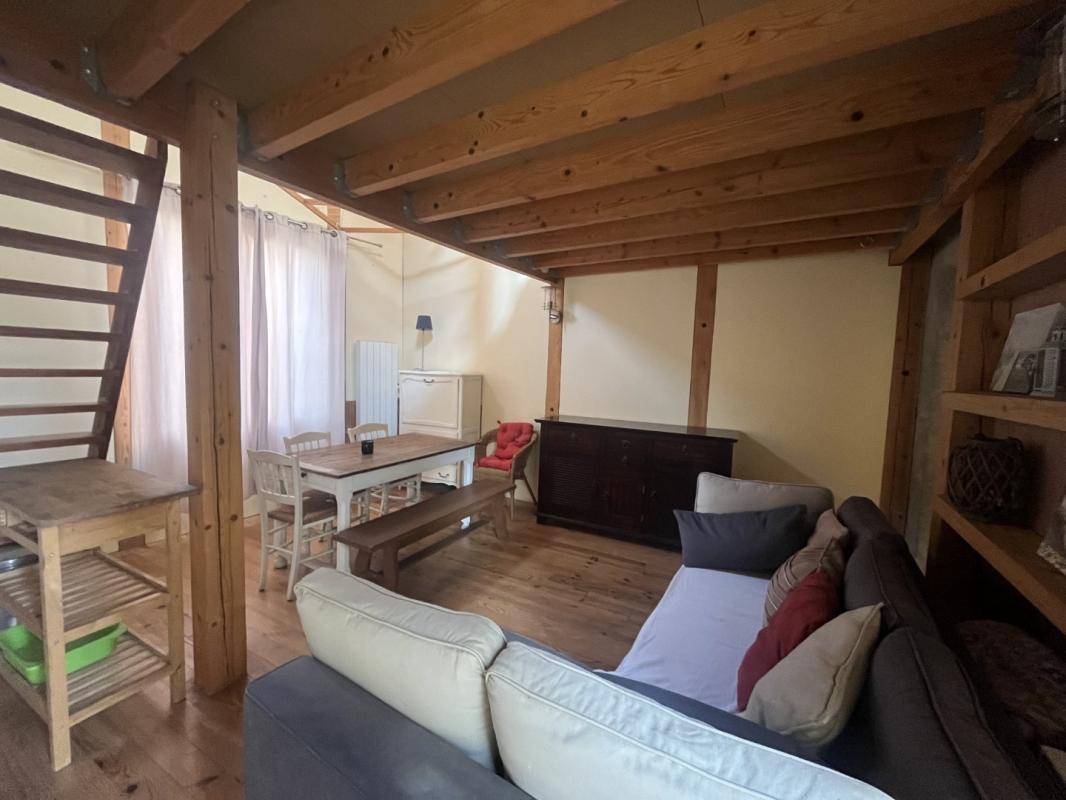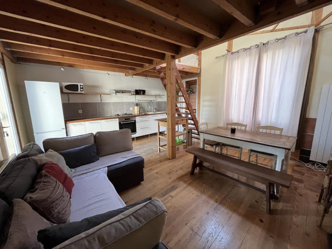 Centre ville de Podensac, appartement T1 au 1er étage composé d'une pièce de vie avec sa cuisine aménagée, salle d'eau + toilettes et un coin nuit séparé. Libre de suite. Climatisation réversible.