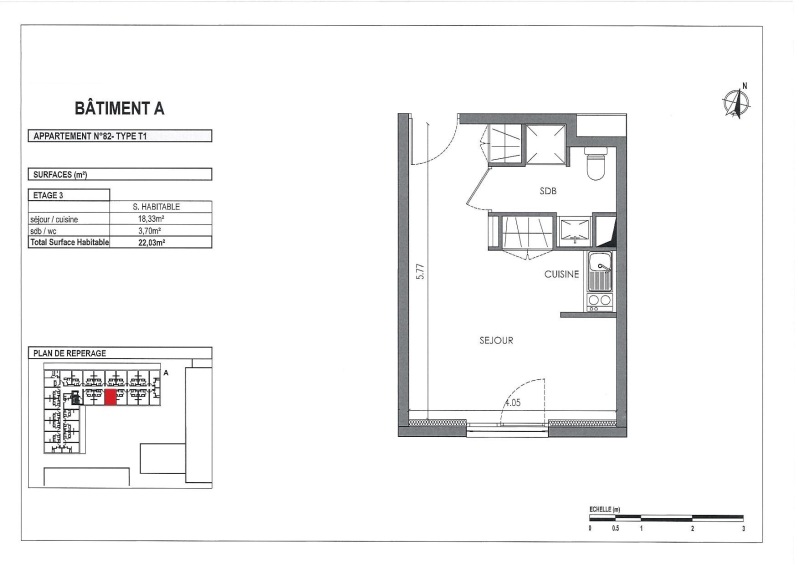 composé d'un séjour, cuisine sur séjour, pièce de 8 m2, salle de bains et toilettes.