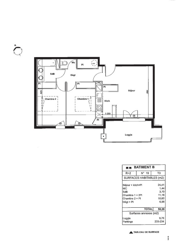 Beau T3 avec loggia de 9.50m² avec double exposition. Il est composé d'une entrée, d'une pièce à vivre avec cuisine équipée (évier inox, plan de travail, plaque 4 feux, hotte, meubles hauts et bas), de deux chambres avec placards, d'une sall...