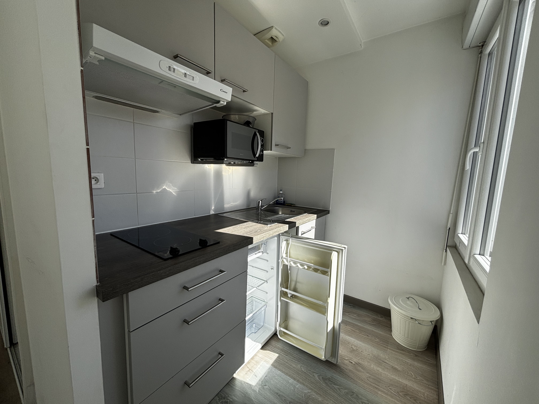 Rue Montmailler, appartement lumineux, rénové, de 29m2 offrant une entrée, un séjour avec de beaux volumes et des rangements, une cuisine neuve aménagée et équipée et une salle d'eau avec WC.