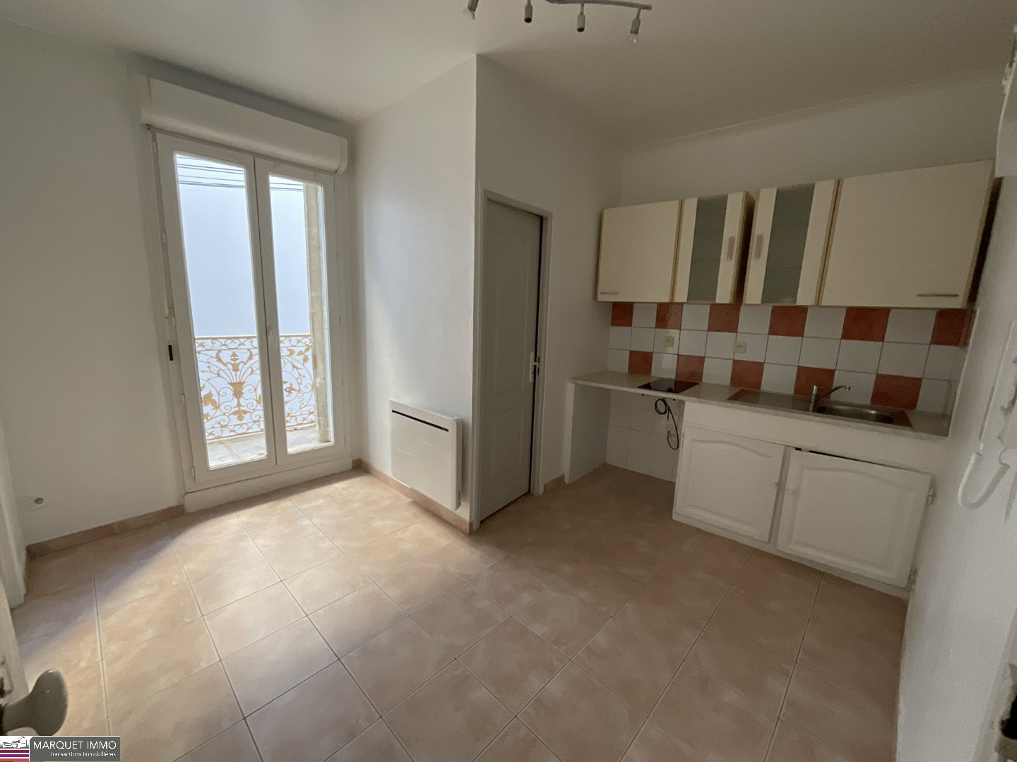 Appartement 2 pièces dans immeuble calme au 1er étage comprenant un coin cuisine donnant sur un séjour (la cuisine est meublée et partiellement équipée avec un top-frigo, une plaque induction deux feux et une hotte), une chambre, une salle de bains avec WC.
