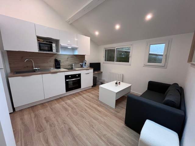 Appartement situé au rez-de-chaussée : Pièce de vie avec partie cuisine, salle d'eau wc, une pièce (aveugle) pouvant servir de chambre ou bureau. Libre.