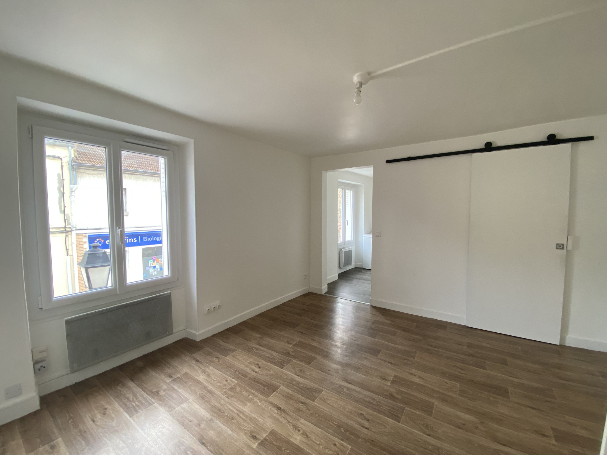Appartement situé en face de la gare comprenant un salon lumineux, une kitchenette ouverte, une chambre, une salle de bain avec wc.