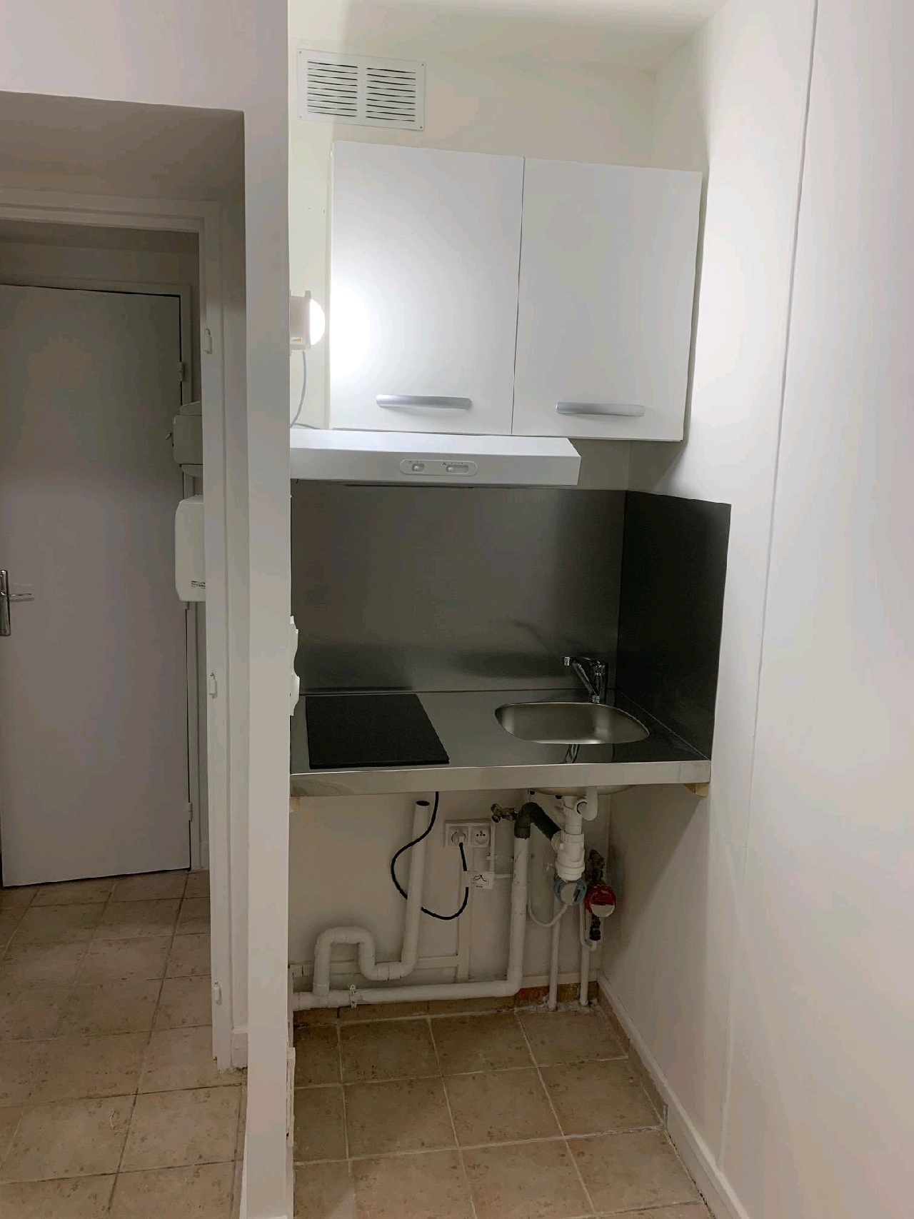 5' RER, petit immeuble rural, Appartement F1: cuisine équipée (plaques, frigo), séjour, salle d'eau avec wc.