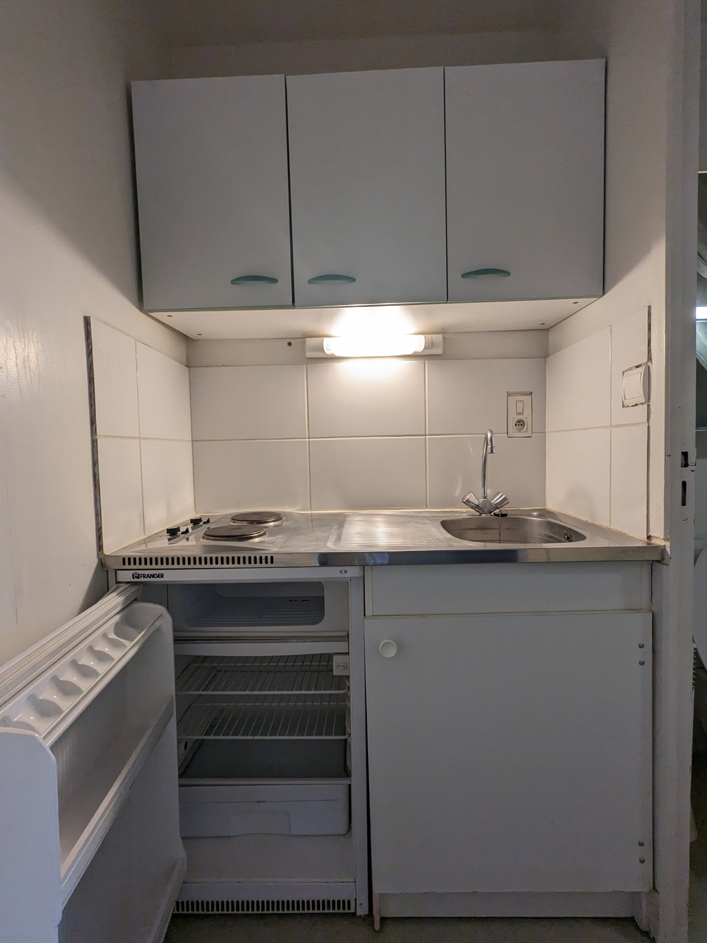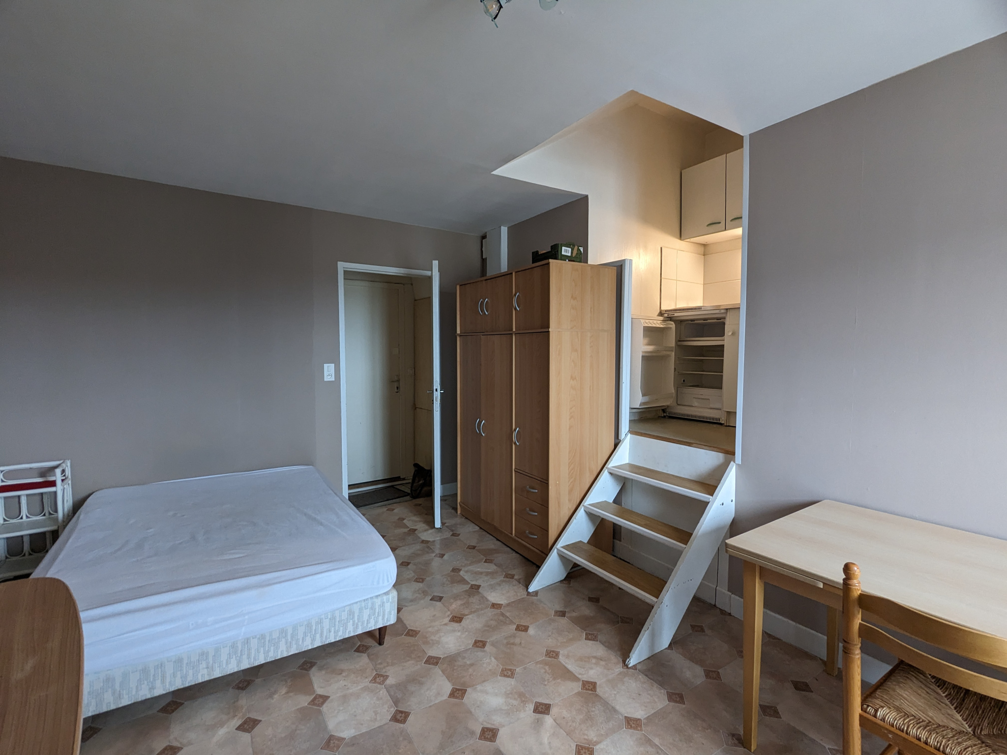 A louer studio entièrement rénové à Châteauroux comprenant une pièce principale avec cuisine aménagée et équipée de plaques de cuisson électriques, réfrigérateur avec partie congélateur et machine à laver, meuble dressing, salle d'eau avec WC.
