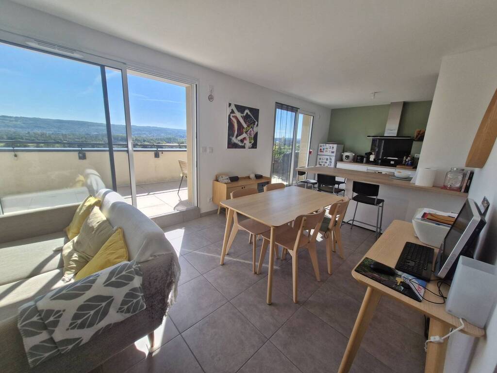 L'ISLE D'ABEAU, secteur Pierre Louve, résidence au calme, ascenseur. Au 3éme et dernier étage, vue panoramique, appartement T4 de 75.31m² avec terrasse de 25.36m², entrée avec placard, espace de vie très lumineux avec cuisine meublée, 3 chambres dont...