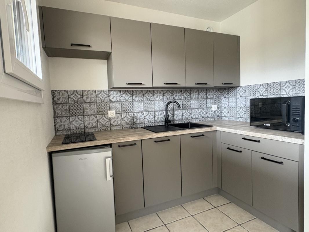 Résidence des frères de Maistre à La Motte Servolex, appartement de type T1 meublé au deuxième étage comprenant : une pièce de vie ouverte sur une cuisine équipée, une salle d'eau avec W.C et un balcon.