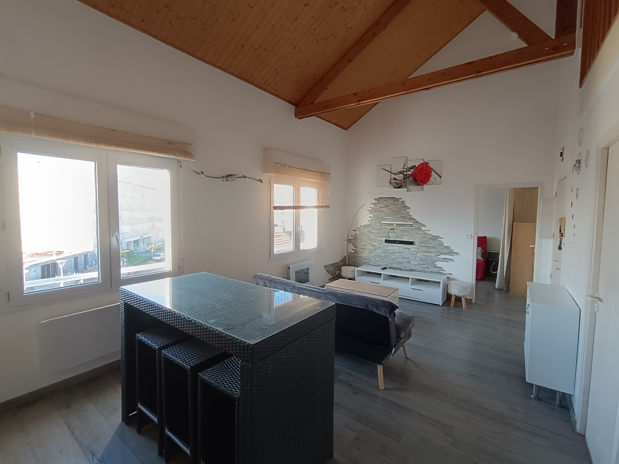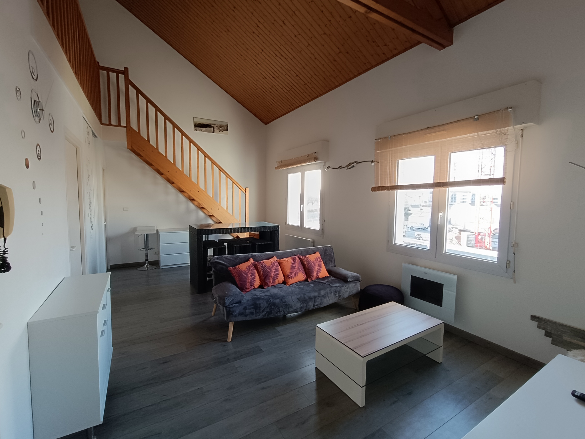 LA ROCHE SUR YON, A PROXIMITE GARE ET COMMERCES, APPT. TYPE 2 BIS DUPLEX MEUBLE (54.43 m2) comprenant : séjour (avec placard), cuisine aménagée et équipée (cuisinière plaque cuisson / four électrique, réfrigérateur, micro-ondes), 2 chambres dont 1 en mezzanine...