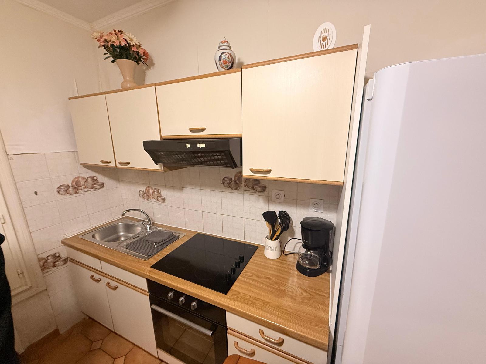 Appartement 2 pièces dans immeuble calme au 1er étage comprenant un coin cuisine donnant sur un séjour (la cuisine est meublée et partiellement équipée avec un top-frigo, une plaque induction deux feux et une hotte), une chambre, une salle de bains avec WC.